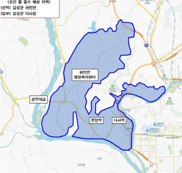 이번 수계조정으로 12월 5일 22시부터 다음날 06시까지 달성군 하빈면 전역 및 다사읍 일부 2만 4천 세대에 흐린 물이 나올 수 있다.