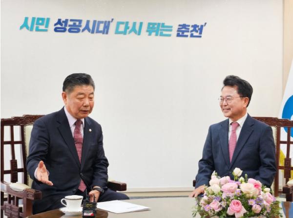 이에 육동한 춘천시장은 “2년 6개월 만에 처음 접견실 와주셔서 대단히 감사하다”라며 “오늘과 같은 의장님의 통 큰 행보를 앞으로도 보여달라며, 의회의 여러 현안에 대한 의견을 경청하고 시정 추진 과정에 반영하겠다”라고 언급했다.