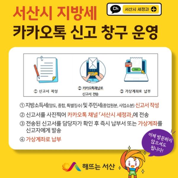 충남 서산시가 비대면 세정 서비스를 확대하고 시민의 납세 편의를 향상하기 위해 올해부터 세정과 카카오톡 채널을 통해 ‘지방세 카카오톡 신고 창구’를 운영한다고 7일 밝혔다.