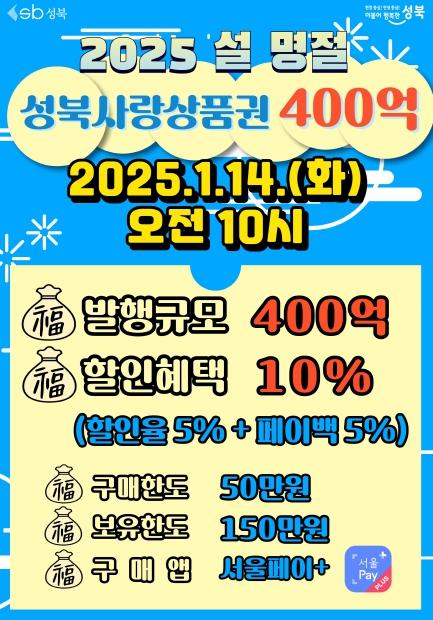 서울 성북구가 2025년 설 명절을 앞두고 400억 규모의 ‘성북사랑상품권’을 발행한다.