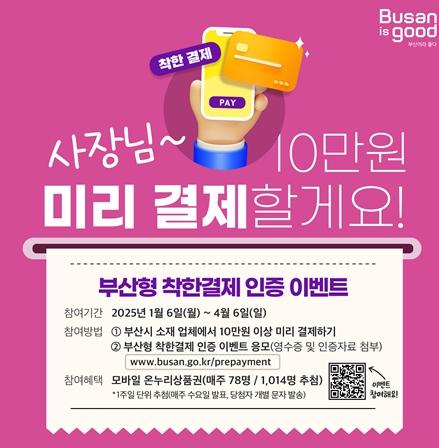 부산시는 내수 부진과 고금리 상황으로 어려움을 겪고 있는 부산 소상공인과 자영업자를 지원하기 위해 민간부문 '부산형 착한결제 캠페인'을 올해 1월부터 본격 추진한다고 밝혔다.