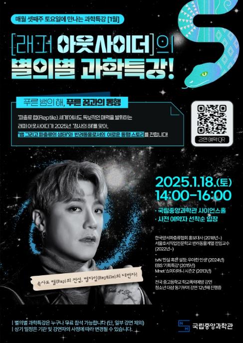 2025년 첫 강연은 1월 18일 토요일 오후 2시에 열린다. 이번 특강에서는 을사년 푸른 뱀의 해를 맞아 ‘푸른 뱀의 해, 푸른 꿈과의 동행’이라는 주제로 진행된다. 이번 특강에서는 래퍼 아웃사이더를 초청하여 다양한 뱀과 파충류의 생태, 그리고 반려동물로서 파충류의 매력 등에 대해 들어볼 예정이다.