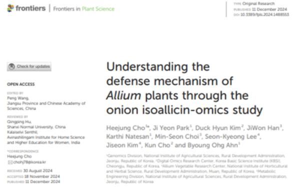 이번 연구 결과는 Frontiers in Plant Science(IF 5.6)에 논문으로 게재됐으며, 양파의 생화학적 방어시스템 관련 기초자료로 친환경 농업기술과 병 저항성 품종 개발에 활용될 수 있을 것으로 기대한다.