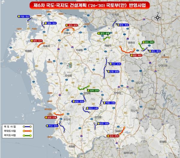 이 외에 제6차 건설계획안에 포함된 사업으로는 △서산 영탑∼대산 국도29호 4차로 신설 4.3㎞ 863억 원 △부여 임천∼장암 국도29호 4차로 신설 5.1㎞ 983억 원 △천안 병천∼동면 국도21호 4차로 확장 5.8km 526억 원, △공주 유구 신영∼문금 국도39호 4차로 확장 9km 885억 원, △아산 송악 거산∼유곡 국도39호 4차로 확장 6.9km 715억 원, △아산 둔포∼평택 팽성 국도45호 6차로 확장 3.8km 802억원 △부여 은산 홍산∼나령 국도29호 4차로 확장 7.3km 832억 원 △청양 남양∼청양 국도29호 4차로 확장 5.5km 886억 원 △청양 정산 학암∼서정 국도39호 4차로 확장 5.4km 472억 원△아산 배방∼천안 목천 국도대체우회도로(민선8기 역점사업) 4차로 신설 14.3㎞ 6,180억 원 △보령 남포∼신흑 국도대체우회도로 2차로 신설 5.7km 934억 원 △서산 성연∼인지 국도대체우회도로 4차로 신설 5.6km 1668억 원 △논산 은진∼부적 국도대체우회도로 4차로 신설 6.5km 1866억 원 △당진 정미∼송악 4차로 신설 6.9㎞ 1262억 원 △천안 병천∼북면 국지도57호 2차로 신설 6.8km 972억 원 △아산 염치∼음봉 국지도70호 4차로 신설 4.8km 1301억 원 △홍성 장곡∼청양 운곡 국지도96호 2차로 개량 9.4km 511억 원 등이 있다.