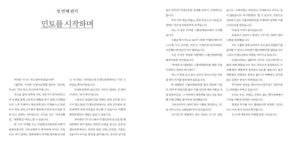 1장.‘민토’를 시작하며 / 2장.어린이를 위한 나라 / 3장.SUV에서 자는 청년 / 4장.골든타임 / 5장.도약을 끌어내리는 모래주머니 / 6장.미래 성장의 다이아몬드 / 7장.여러분의 눈물을 닦아드리고자 / 8장.사우디 리야드에 칠해진 보랏빛 / 9장.시장에 물이 마르면 /10장.학생이 원하는 걸 배우는 학교 / 11장.제2 한강의 기적 / 12장.호주사막의 거미 ‘레드백’ / 13장.나의 스위트홈 / 14장.골드라인에서의 잊을 수 없는 기억 / 15장.진정한 지방시대를 열며 / 16장.보스턴 스퀘어 / 17장.아메리칸 파이 / 18장.‘용기있는 사람들 상’