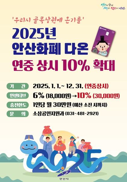 안산시는 안산 지역화폐인 ‘다온’의 연중 상시 인센티브를 기존 6%에서 10%로 4%p 상향 조정한다고 25일 밝혔다.