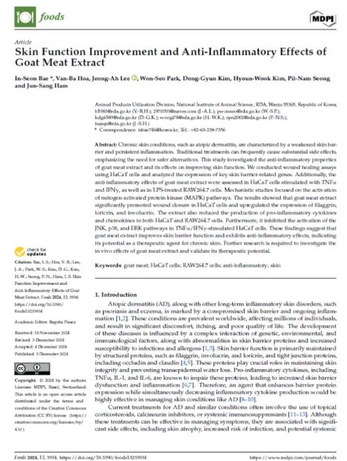 연구진은 이번 연구가 염소 고기가 피부 질환 개선에 활용할 수 있는 과학적 기초자료를 확보했다는 데 의의를 두고 있다. 연구 결과는 국제학술지 Foods에 게재됐다.