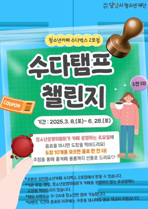 2023년 8월 24일 개관 이후 당진 청소년들을 위해 다양한 시설 제공 및 프로그램을 진행한 당진청소년카페 수다벅스 2호점은 2025년을 맞이하여 매주 토요일 카페 이용 청소년에게 도장을 찍어주는 카페테리아 쿠폰 이벤트를 진행한다.