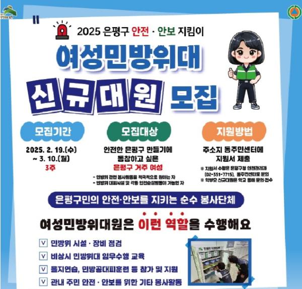 은평구는 은평의 안전과 안보를 지키는 순수여성봉사단체 여성민방위대를 내달 10일까지 모집한다고 밝혔다.