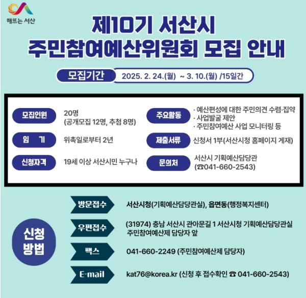 충남 서산시는 주민참여예산의 효율적이고 투명한 운영을 위해 제10기 주민참여예산위원회 위원 20명을 모집한다고 24일 밝혔다.