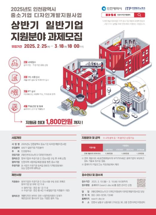 인천테크노파크(인천TP)와 인천시는 ‘중소기업 디자인 개발지원사업’의 참여기업 약 40개 사를 다음 달 18일까지 모집한다고 밝혔다.