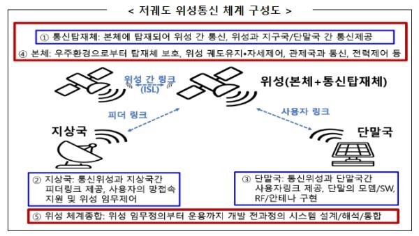 ‘저궤도 위성통신 기술개발’ 사업은 저궤도 통신위성[2기]과 지상국·단말국으로 구성된 저궤도 위성통신 체계 1식을 개발하는 것으로서 이번 사업을 통해 위성과 지상간, 위성과 위성간 통신기능을 수행하는 통신탑재체, 지상국, 단말국, 이를 보조하는 본체와