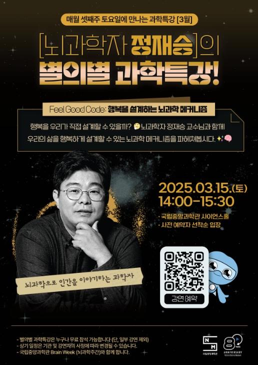 국립중앙과학관(관장 권석민)은 과학 문화 확산을 위해 매월 셋째 주 토요일에 만나는『별의별 과학특강』을 매월 진행하고 있다. 『별의별 과학특강』은 일상의 다양한 주제를 과학적으로 풀어보는 대중 강연으로, 다양한 분야의 대중 친화적인 전문가와 일상에 녹아있는 주제를 통해 과학의 재미를 전달하는 브랜드 강연 프로그램이다. 이번 강연은 우리 시대 가장 주목할 만한 과학자인 KAIST 뇌인지과학과 정재승 교수가 연사로 나설 예정이다.
