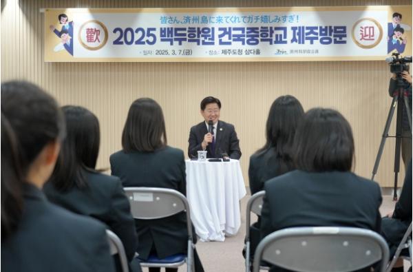 오영훈 지사는 7일 오후 도청에서 일본 오사카 재일한국인 학교인 백두학원 건국중학교 학생들을 초청해 환영 간담회를 가졌다.