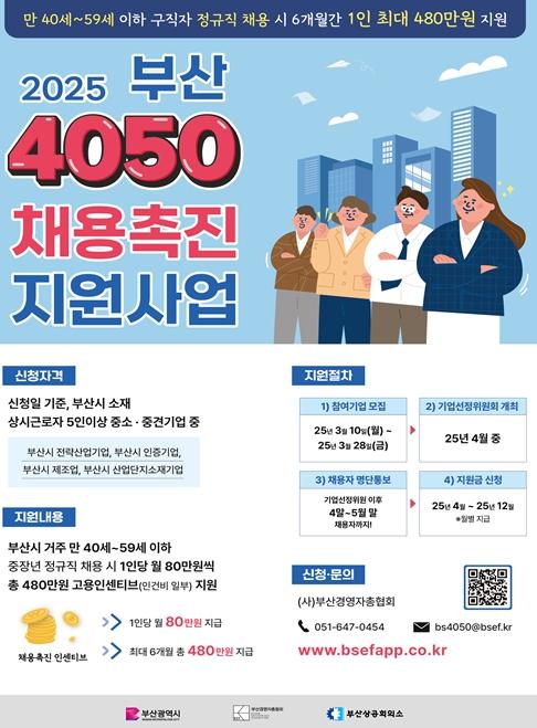 부산시는 '2025 부산 4050 채용촉진 지원사업'에 참여할 기업을 오늘(10일)부터 3월 28일까지 모집한다고 밝혔다.