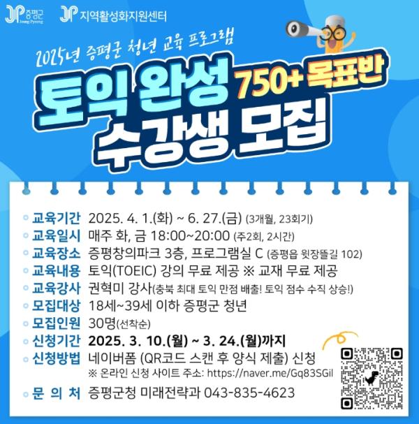 충북 증평군이 10일부터 24일까지 상반기 청년 교육 프로그램 ‘토익 완성 750+ 목표반’ 수강생 30명을 선착순 모집한다.