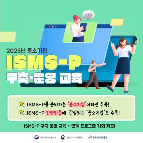과학기술정보통신부, 개인정보보호위원회는 한국인터넷진흥원과 함께, 국내 영세‧중소기업들이 보안 역량을 강화할 수 있도록 ‘정보보호 및 개인정보보호 관리체계(Personal Information & Information Security Management System, 이하 ‘ISMS-P’) 구축‧운영 교육’을 실시한다.