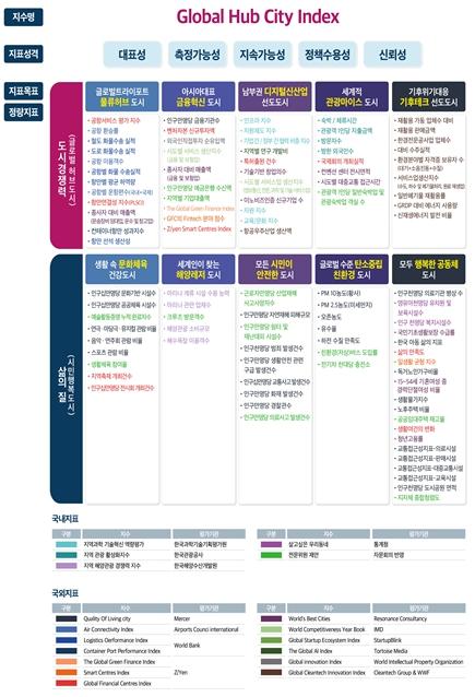 '글로벌 허브 시티 인덱스(Global Hub City Index)'는 크게 '글로벌 허브도시(도시경쟁력)'와 '시민행복도시(삶의 질)', 2개의 목표 아래 각각 5개의 추진전략으로 구성된다.