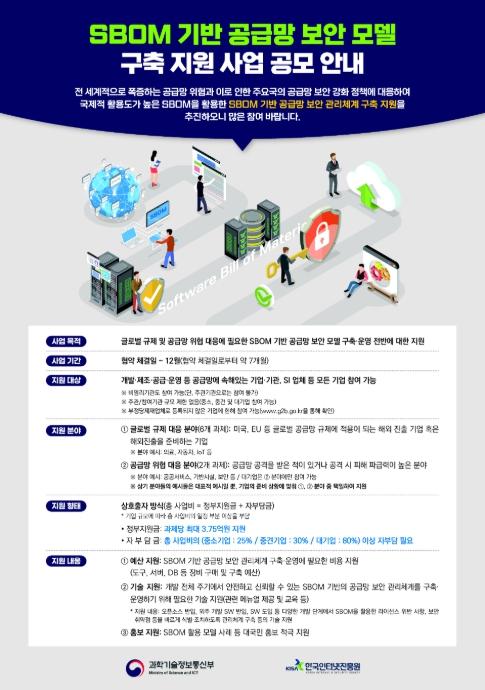 과학기술정보통신부는 한국인터넷진흥원(KISA)과 함께 국제적 규제 및 소프트웨어 공급망 위협에 대응하기 위해 국내기업들의 소프트웨어 공급망 보안 관리체계 구축 및 운영 전반에 대해 지원하는 ‘소프트웨어 자재명세서(SBOM) 기반 소프트웨어 공급망 보안모형 구축 지원사업’을 본격 추진한다고 밝혔다.