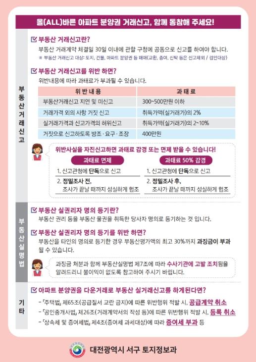 대전 서구는 부동산 거래 신고 위반에 대한 인식 부족으로 인해 발생할 수 있는 주민 불이익을 사전 예방하고 올바른 부동산 거래 질서를 확립하기 위해, 아파트 분양권 전매 거래 신고 안내문을 제작·배포한다고 이달 2일 밝혔다.