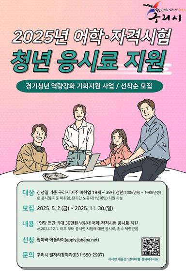 구리시는 오는 2일부터 미취업 청년들의 취업 역량 강화를 위해 어학·자격시험 응시료를 지원한다고 밝혔다.
