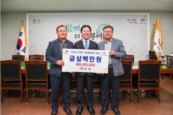 ㈜삼일은 지난 1일 부여군청을 방문하여 인재 육성을 위한 장학금 3백만 원을 (재)부여군굿뜨래장학회(이사장 박정현)에 기탁했다.
