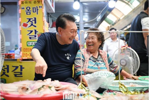 윤석열 대통령은 8월 5일 오후 남해안 최대 수산시장인 경남 통영중앙시장을 방문했다. 대통령의 통영 시장 방문은 지난해 3월 제12회 수산인의 날 기념식 참석차 방문한 이후 1년 5개월 만이다.