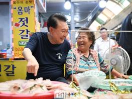 대통령은 수십여 곳의 상점을 돌며 상인 한 분 한 분과 악수를 하며 "잘 지내셨나요", "고생 많으십니다"며 격려했다. 상인들은 대통령에게 "오늘같이 무더운 날 와주셔서 감사합니다"라며 응원을 보냈다. 한 상인은 "국민이 키운 윤석열"이라는 대선 후보 당시 전단을 흔들며 "화이팅"을 외쳤고, 몇몇 상인들은 땀이 흐르는 대통령에게 멀리서 부채질을 해주는 배려를 보이기도 했다.
