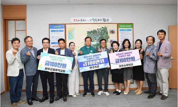 지난 22일 완주9경(대표 소덕임), 완주풍류학교(대표 김종덕), 완주소목학교가 각 100만 원씩 총 300만 원의 성금을 완주군 저소득층 및 수해 피해민을 위해 전달했다.