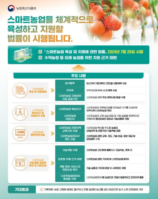 농림축산식품부는 '스마트농업 육성 및 지원에 관한 법률'이 7월 26일부터 시행된다고 밝혔다.