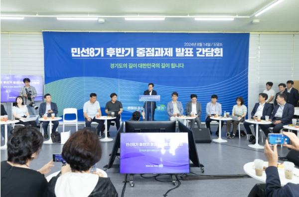 김동연 지사는 14일 도담소(옛 경기도지사 공관) 기자간담회에서 사람중심경제(휴머노믹스) 실천을 위한 임기 후반기 중점과제로 이런 내용을 담은 기회·돌봄·기후·평화 등 4개 경제분야 신규 사업 구상을 밝혔다.