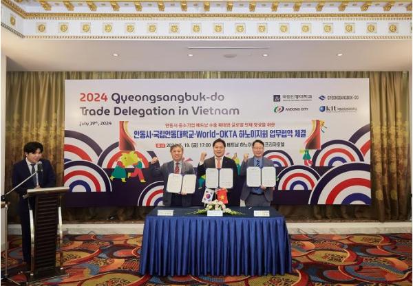 안동시는 7월 19일 베트남 하노이에서 정진용 안동시 투자유치과장, 임재환 국립안동대학교 LINC3.0 사업단장, 윤휘 World-OKTA(세계한인무역협회) 하노이지회장을 비롯해 관련 인사들이 참석한 가운데 중소기업 수출 확대와 글로벌 인재 양성을 위한 상호 업무협력 협약을 체결했다고 밝혔다.