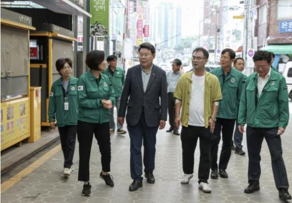 오영주 중소벤처기업부 장관이 21일 당진전통시장을 찾아 수해 복구 상황을 점검하고 상인들의 목소리를 청취했다.