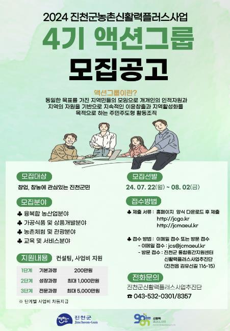 진천군은 창업·창농 플랫폼을 통한 사회적경제 생태계 구축을 위해 신활력플러스사업의 핵심 주체인 4기 액션그룹을 오는 8월 2일까지 모집한다고 23일 밝혔다.