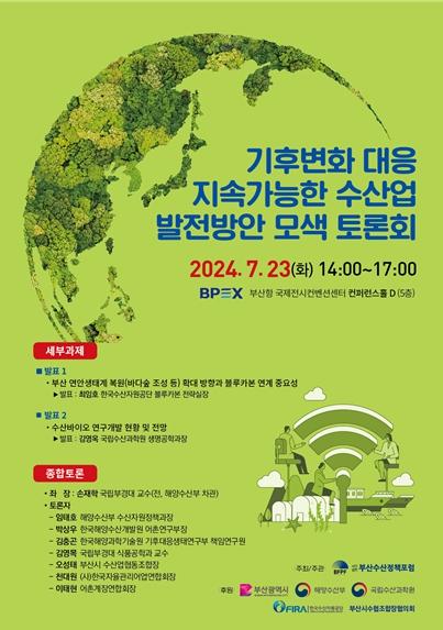 부산시는 오늘(23일) 오후 2시 부산항국제전시컨벤션센터 컨퍼런스홀에서 '기후변화 대응, 수산업 발전방안 모색 토론회'가 열린다고 밝혔다.