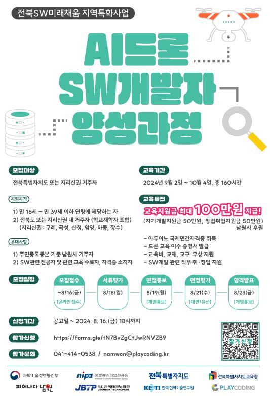 전북SW미래채움 사업 관계자는 “이번 AI드론 SW개발자 양성과정‘을 통해 전북자치도와 지리산권 청년들의 SW 및 AI 개발 역량을 강화하고, 지역의 IT 인재 육성에 기여할 것으로 기대한다”고 말하며 “청년들의 많은 관심과 참여를 기대한다”고 전했다.