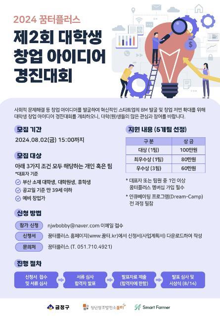 부산시 금정구 청년창조발전소 꿈터플러스는 창업 아이디어를 발굴하여 혁신적인 스타트업의 창업 저변 확대를 위해 ‘2024 제2회 대학생 창업 아이디어 경진대회’를 개최한다.