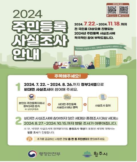 원주시는 주민등록 정확성 제고를 위해 7월 22일부터 11월 18일까지 ‘2024년 주민등록 사실조사’를 실시한다.