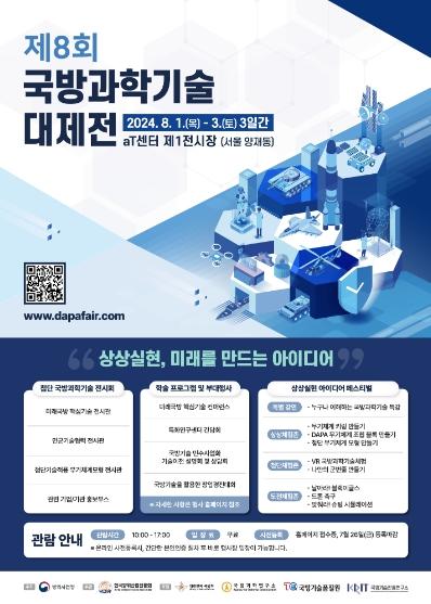 방위사업청은 “상상실현, 미래를 만드는 아이디어”를 주제로 8월 1일부터 3일까지 서울 양재 aT센터에서 '제8회 국방과학기술 대제전'을 개최하고, 4차 산업혁명 시대의 창의적·도전적 아이디어가 미래에 실현되는 모습을 직접 체험할 수 있도록 다양한 행사를 마련한다고 밝혔다.
